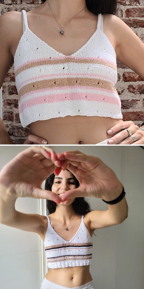 This top has it all – thin straps, v-neck, stripes and delicate openwork! Take a look below to see Berenice’s design in full, and imagine adding it to your own wardrobe. Such simple designs are perfect, because you can elongate it if you want, or choose whatever colors you like.
